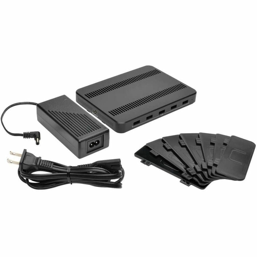 USB charging station features five USB-A ports, each capable of delivering up to 5V, 2.4A, to charge even battery-intensive devices. Charging station doubles as a storage unit by providing space to neatly organize cabling while your devices charge. When not in use, cables can be stored in the compartment and kept out of the way. Adjustable brackets accommodate the number and size of the devices being charged. The unit protects against overheating, overcurrent and overcharging. Plus, it stops charging as soon as your devices’ batteries are at full capacity to protect your battery life. Each port complies with USB Battery Charging (BC) specification v1.2. Charging station does not require a computer to let you take it anywhere AC power is available.