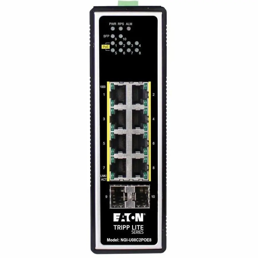 Eaton Tripp Lite Series 8-Port Unmanaged Industrial Gigabit Ethernet Switch – 10/100/1000 Mbps, PoE+ 30W, 2 GbE SFP Slots, -40° to 75°C, DIN Mount, TAA