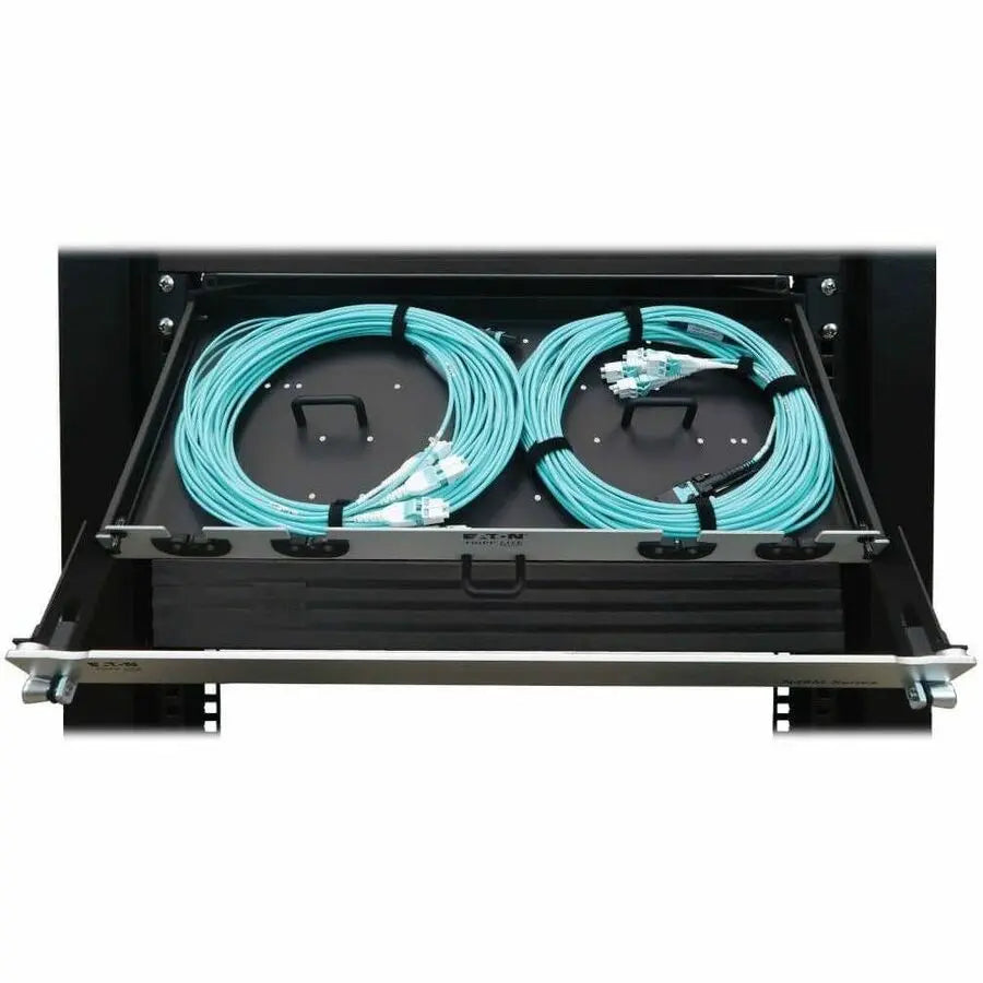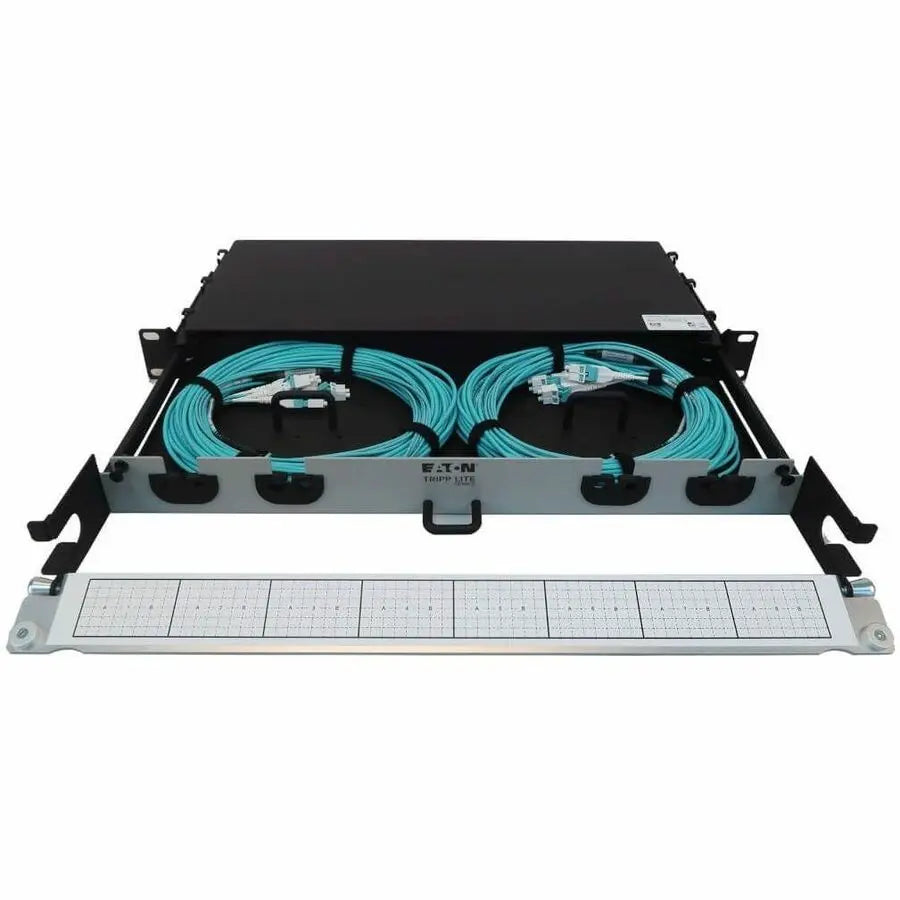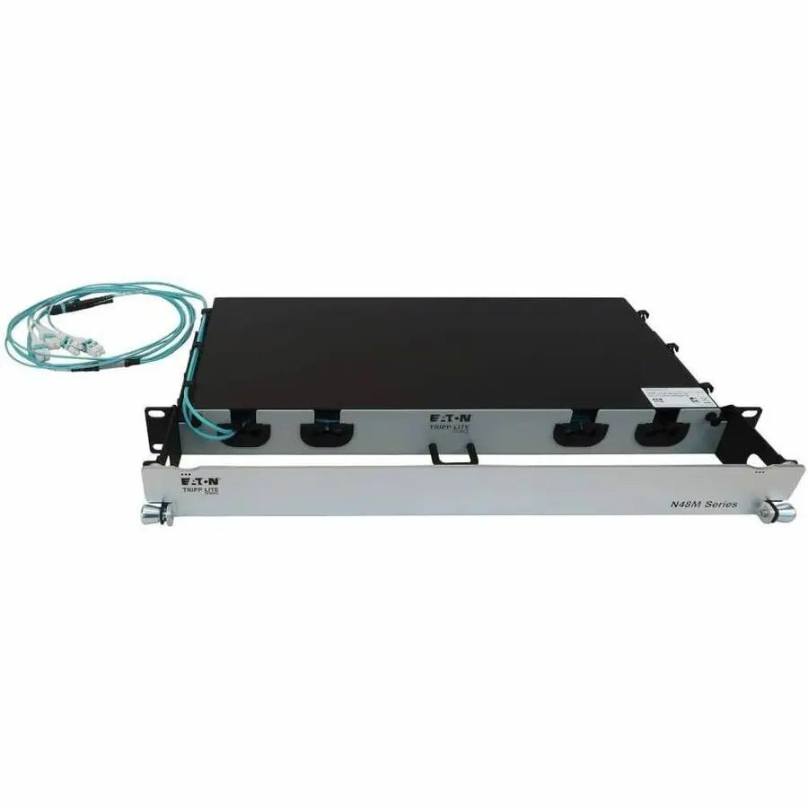 All necessary cabling is included with this preloaded fiber panel, coiled inside and ready for immediate use. The aluminum 1U chassis features two 8-fiber MTP/MPO-PC to LC Duplex multimode trunk cables, both 20 meters (65.6 feet) in length to make management easy. The panel opens to provide easy access to stored cables. Use only as much cabling as you need. The remainder stores inside the chassis to eliminate cable clutter, allow better airflow through the rack and make equipment maintenance and replacement easier. The cables and panels have labels to help with organization. You also avoid the expense and effort of custom cabling. The flexibility in cable length lets you reuse the cables if equipment is moved. The N48M-2M8L4-20 mounts in just 1U of space in an EIA-standard 19-inch rack.