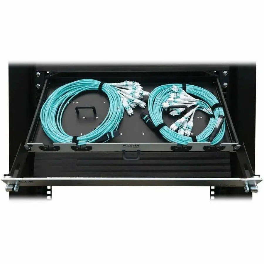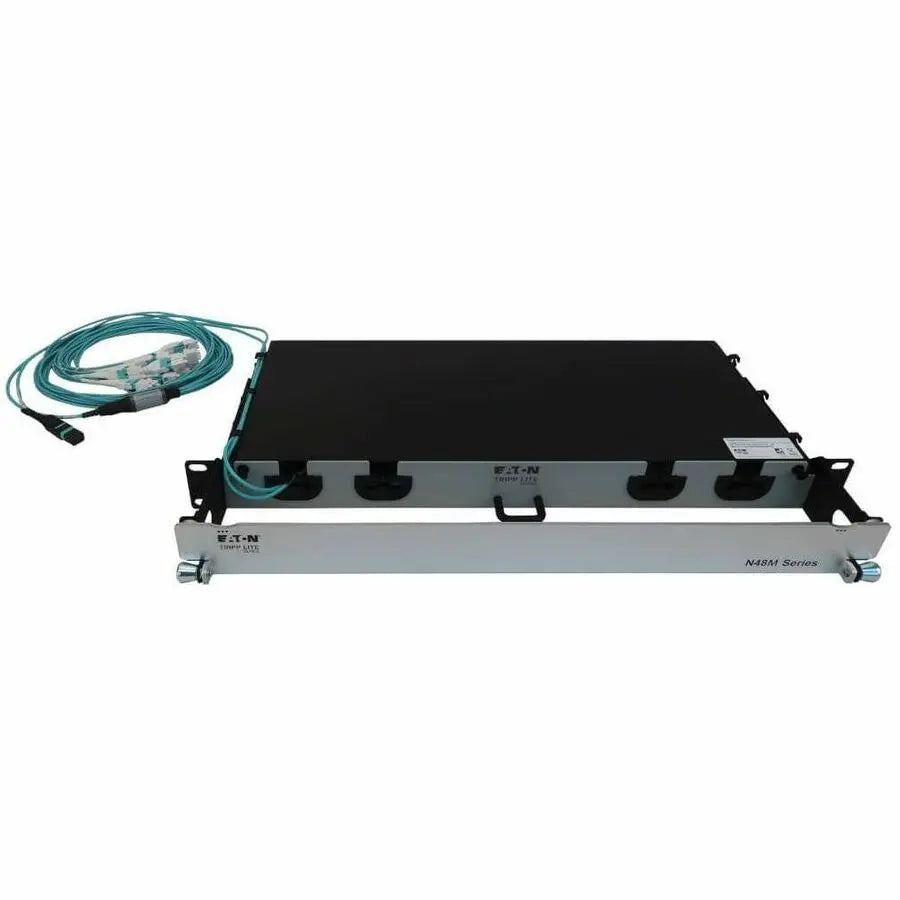 All necessary cabling is included with this preloaded fiber panel, coiled inside and ready for immediate use. The aluminum 1U chassis features two 24-fiber MTP/MPO-PC to LC Duplex multimode trunk cables, both 10 meters (32.8 feet) in length to make management easy. The panel opens to provide easy access to stored cables. Use only as much cabling as you need. The remainder stores inside the chassis to eliminate cable clutter, allow better airflow through the rack and make equipment maintenance and replacement easier. The cables and panels have labels to help with organization. You also avoid the expense and effort of custom cabling. The flexibility in cable length lets you reuse the cables if equipment is moved. The N48M-2M24L12-10 mounts in just 1U of space in an EIA-standard 19-inch rack.