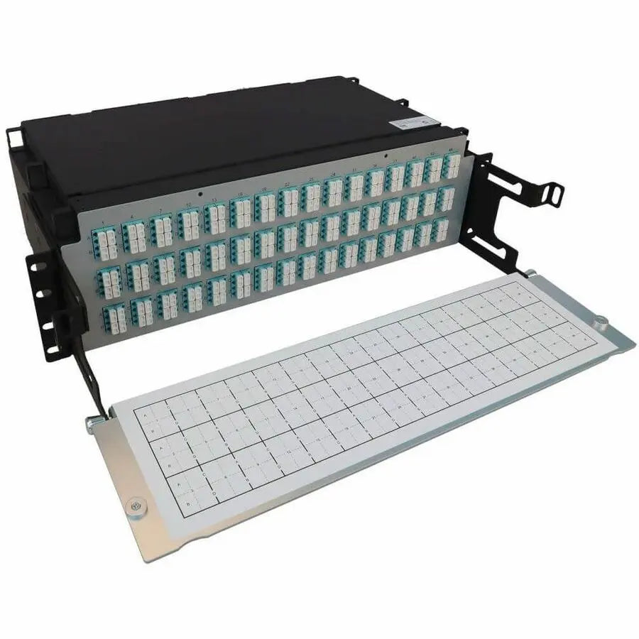 - 192 LC Duplex ports protected by fold-down front panel with organization labels