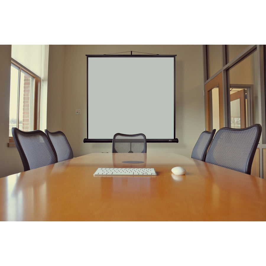• 85-inch Diagonal, 1:1 Aspect Ratio. View Size: 60.0″ H x 60.0″ W. Overall Size: 105.7″ H x 66.8″ W x 43.3″ D. Black Case.