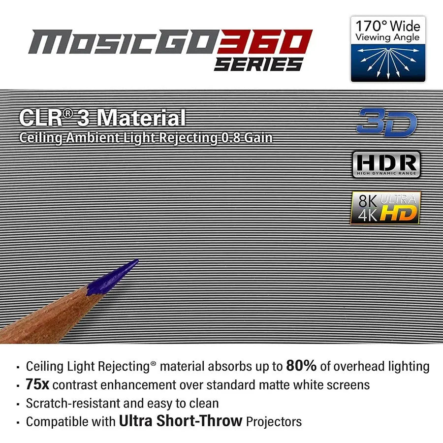 EliteProjector® MosicGO® 360 Series, An Outdoor Ultra-Short Throw DLP Projector Includes Indoor & Outdoor Movie Screen(s). Allows flexibility for Winter Indoor 103″ Ambient & Ceiling Rejection Home Cinema Movies, Video Games or Summer Outdoor Camping Backyard Movie. Full Entertainment Package on the Go!
