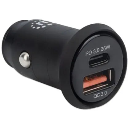 Manhattan Car/Auto Charger, USB-C & USB-A Outputs, USB-C Power Delivery up to 25W, USB-A Charging up to 18W (QC 3.0), Simultaneous Charging, Overload/Overcurrent/Overheat Protection, Black, Three Year Warranty, Blister