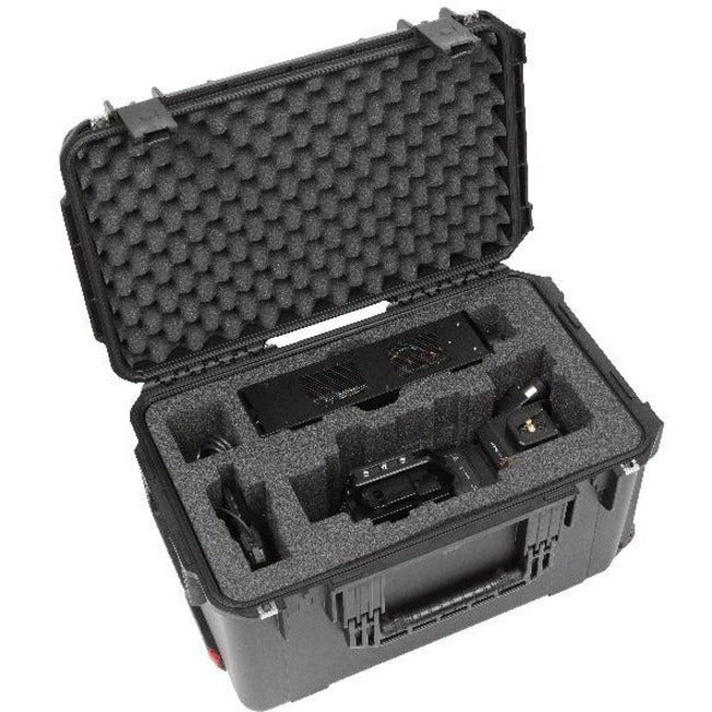 The iSeries 3i-221312BKB was designed to fit the Blackmagic URSA Broadcast Camera and accessories. The case interior features high quality PE foam that’s been form cut to fit the camera with fiber converter attached. There are additional pockets for the studio fiber converter box, the URSA viewfinder, and small accessories.iSeries injection molded waterproof cases are constructed of ultra high-strength polypropylene copolymer resin and feature a waterproof, submersible design (IP67) that is resistant to corrosion and impact damage. Its molded-in hinges, patented “trigger release” latch system, comfortable, snap-down rubber over-molded cushion grip handle, secure stacking, and automatic ambient pressure equalization valve (MIL-STD-648C) all contribute to its military grade design.