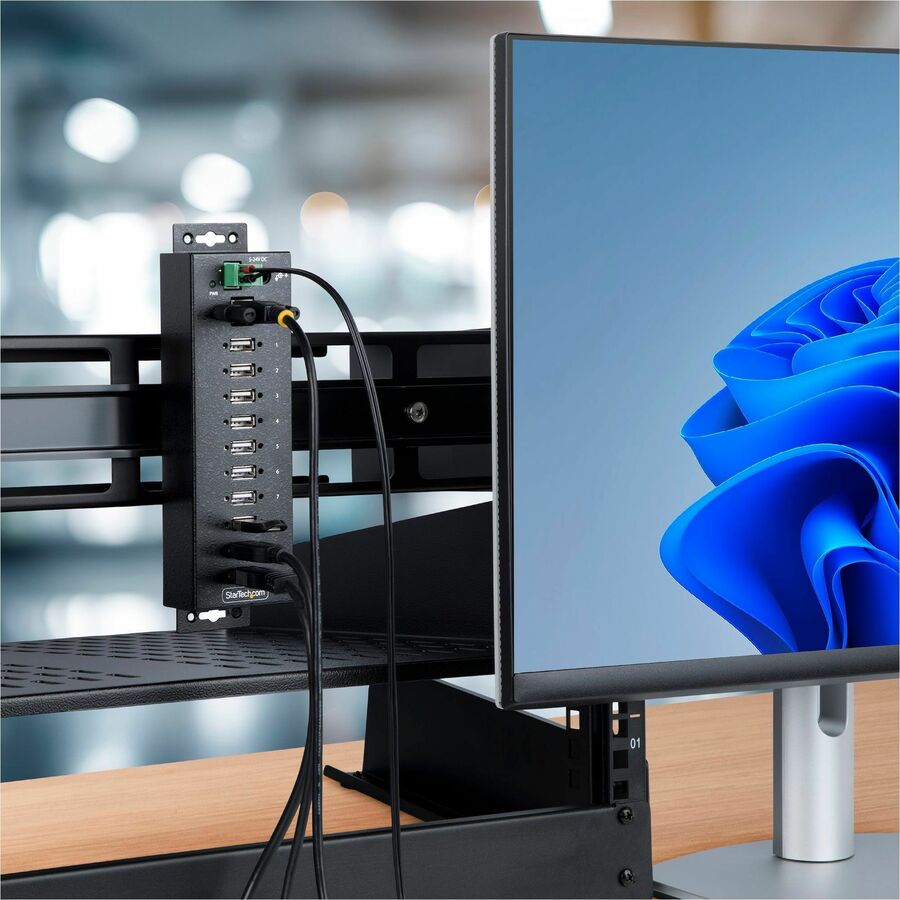 - FLEXIBLE MOUNTING: Multi-port USB Hub features built-in mounting brackets for wall/desk installations; Included DIN rail mounting kit; All the USB ports on the Hub feature screw-lock connectors for preventing accidental disconnection