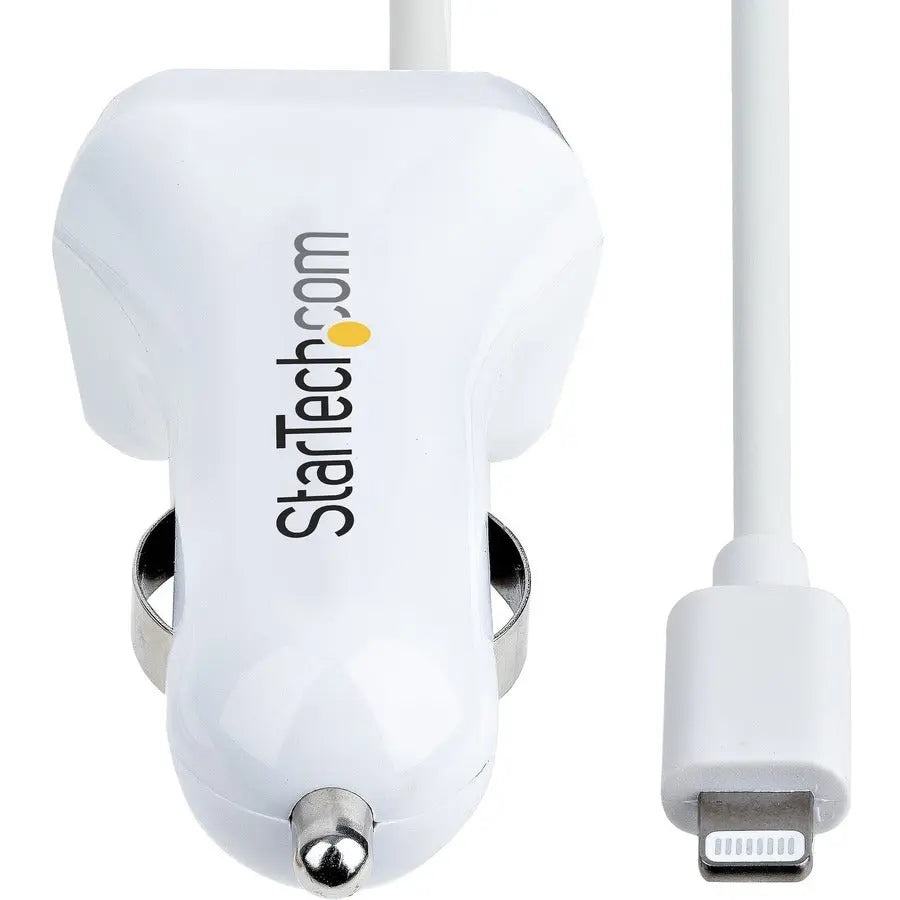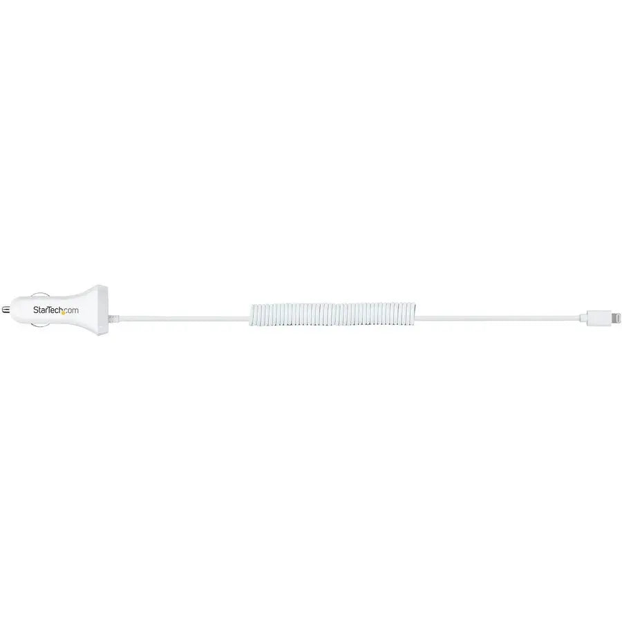 StarTech.com Lightning Car Charger with Coiled Cable, 1m Built-in Cable, 12W, White, 2 Port USB Car Charger Adapter, In Car iPhone Charger