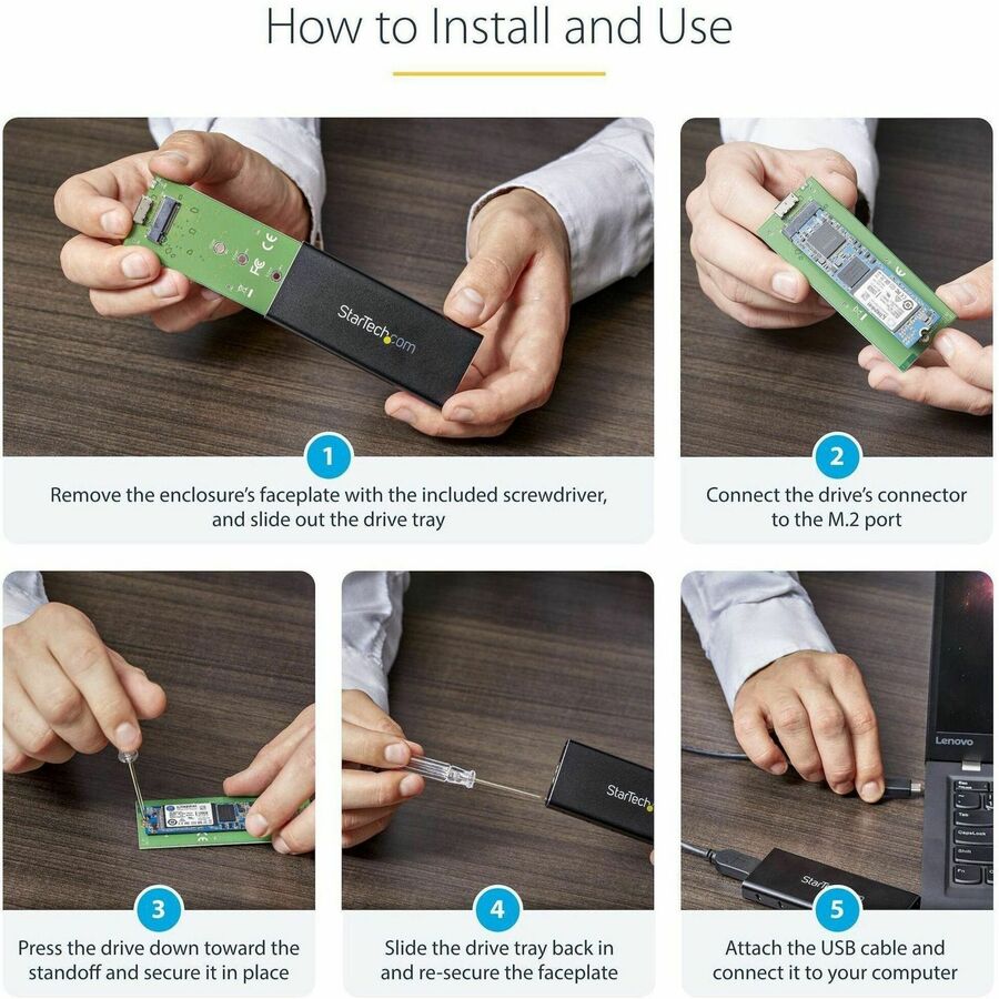 This compact M.2 SATA SSD enclosure lets you add highly portable data storage to any laptop or computer with a USB-C™ port – such as MacBook, Chromebook Pixel™, Dell™ XPS laptops, and many others. It turns your SATA M.2 drive into a high-speed storage solution over a USB 3.1 Gen 2 connection, at up to 10Gbps throughput.