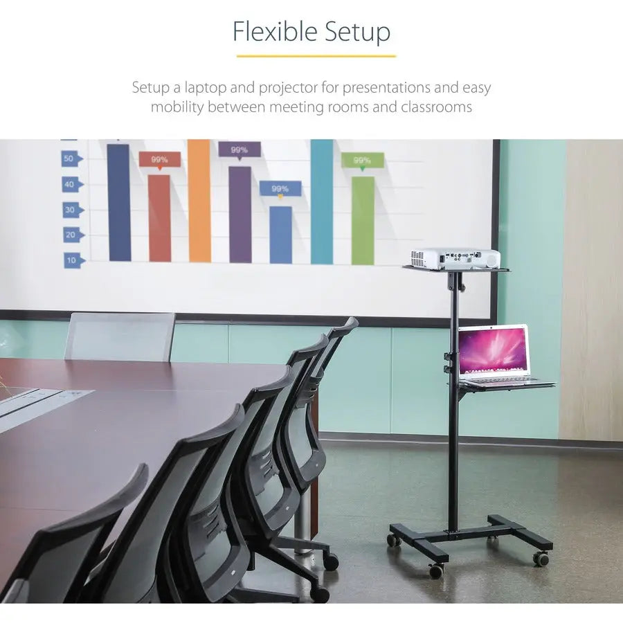 - FLEXIBLE SETUP: Setup a presentation workstation with a projector and laptop to easily transport the trolley between classrooms, boardrooms/conference rooms; Arrange your projector and laptop/notebook computer on either shelf depending on your setup needs