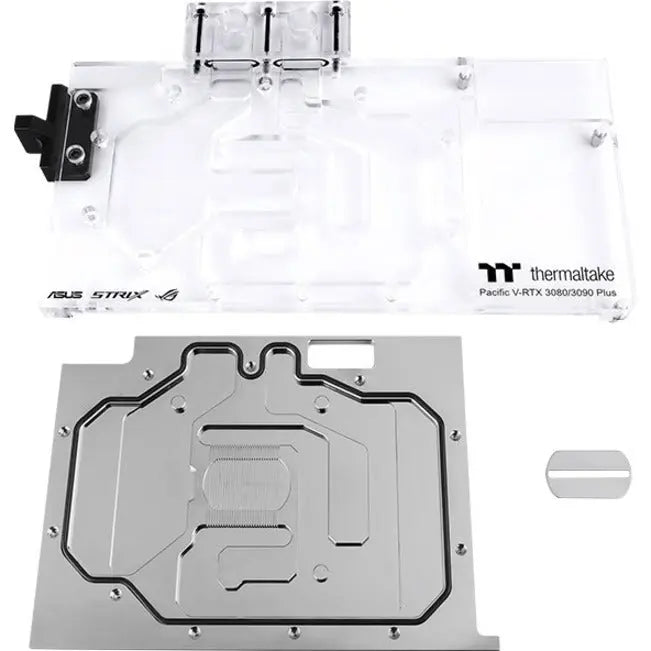 The Thermaltake Pacific V-RTX 3080/3090 Plus (ASUS ROG) GPU Waterblock is a transparent waterblock designed for the latest ASUS ROG STRIX RTX 3080/3090 graphic cards. It supports TT RGB PLUS software and displays 16.8M RGB lighting effects that help your GPU stand out from other builds.