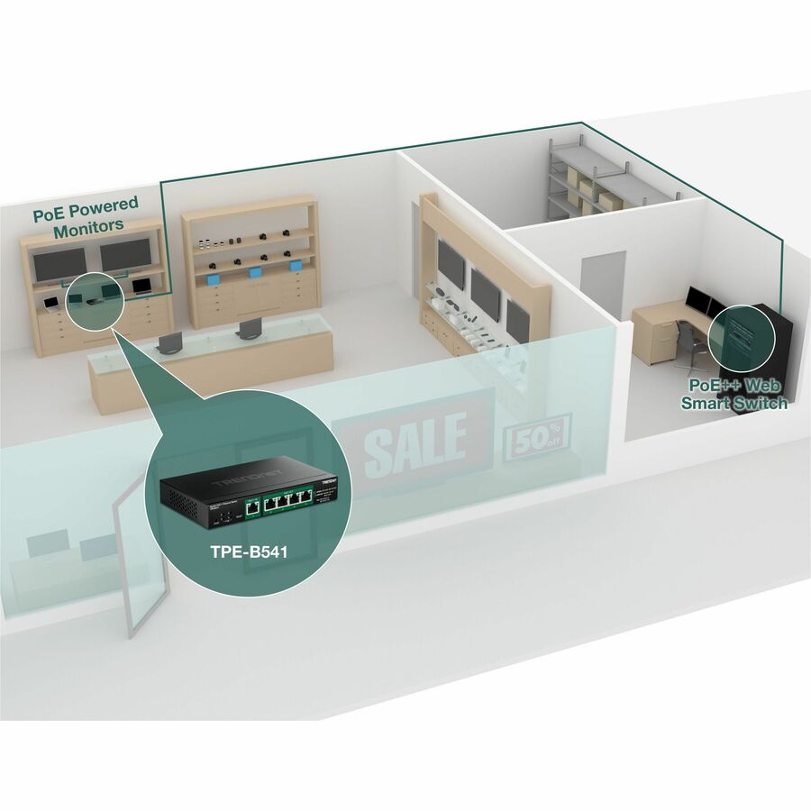 TRENDnet 5-Port Gigabit PoE++ Powered Managed Switch with PoE Passthrough, TPE-B541, 1 x Gigabit PoE++ Input, 4 x Gigabit PoE+ Output, 60W PoE Budget, NDAA TAA Compliant, Lifetime Protection