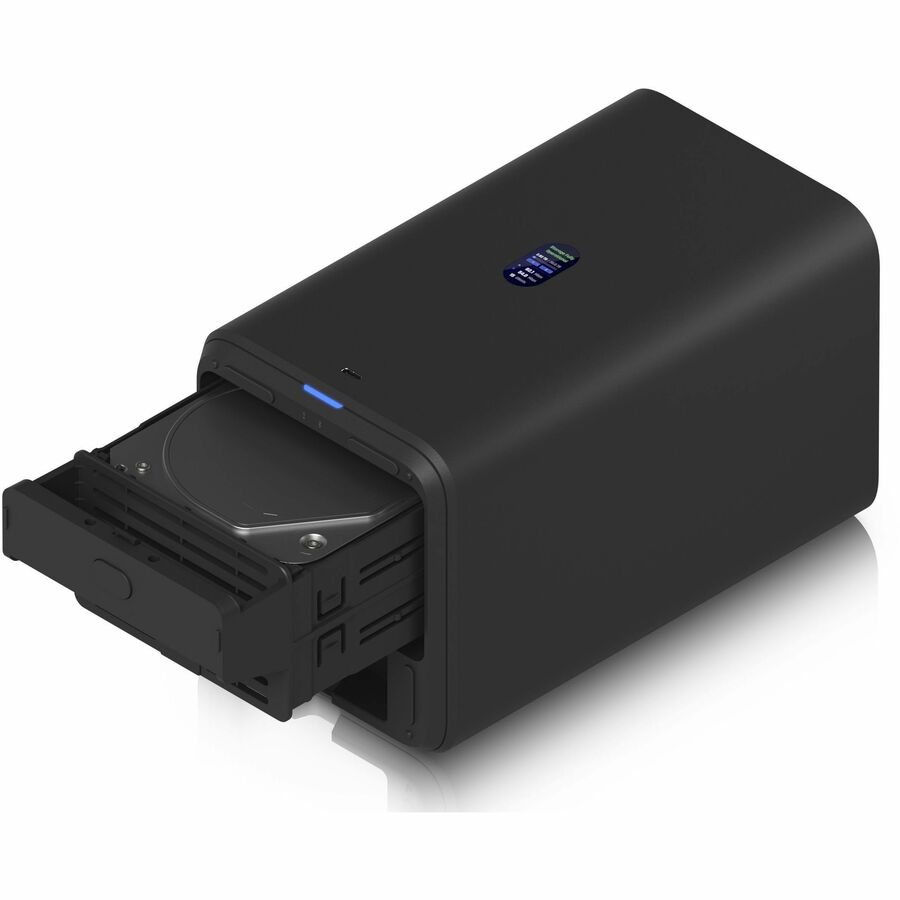 UniFi Network Attached Storage with (2) 3.5″ HDD bays, 2.5 GbE networking, USB-C connectivity, and an included PoE++ adapter, all in a compact footprint.